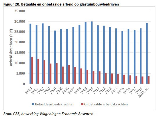 De inzet van betaalde en onbetaalde arbeid op Nederlandse glastuinbouwbedrijven heeft een dalend verloop, zo laten (voorlopige) cijfers van het CBS en onderzoeksinstituut Wageningen Economic Research t/m 2019 zien. Met name het aandeel onbetaalde arbeidskrachten (ondernemers en gezinsleden) daalt sterk. Dit betekent dat er steeds minder glastuinbouwbedrijven zijn en dat er meer met betaalde arbeidskrachten wordt gewerkt.