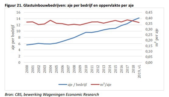 Glastuinbouwbedrijven worden steeds groter en dus neemt het aantal arbeidsjaareenheden ook toe. De productiviteit doet dat niet.