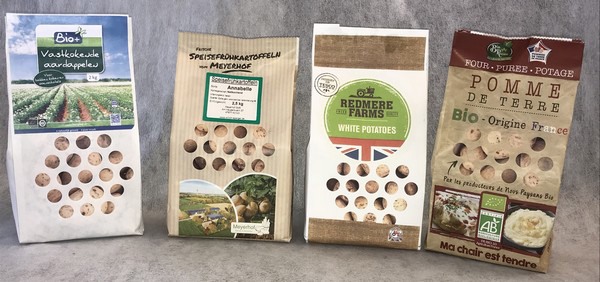 Papieren verpakkingen voor aardappelen, allemaal voor verschillende landen