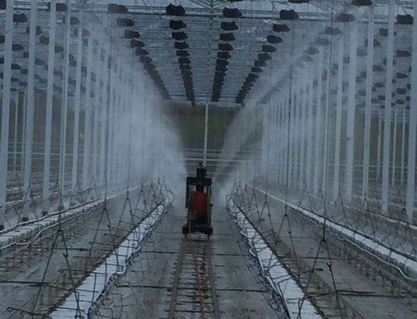 Daarbij is het zaak echt alles in de kas te raken, is de ervaring van Gert-Jan. "De nozzles op onze apparatuur spuiten op de onderkant van de goten, op de goten zelf, iets hoger ook volvelds en de bovenste twee nozzles spuiten de binnenkant van het kasdek."