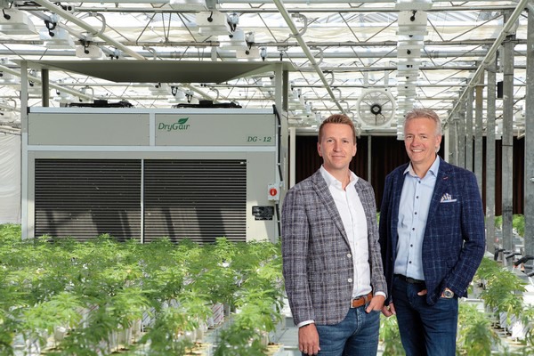 Links Manager Techniek Bas Brinkman en rechts Commercieel Manager international Leo Lievaart bij een DryGair ontvochtigingsinstallatie in de teelt van medicinale cannabis.