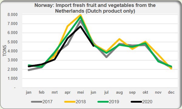 In de eerste helft van dit jaar werd er in Noorwegen 24.650 ton in Nederland geteelde verse groenten en fruit ingevoerd. Dat was ca. 10% minder dan in de eerste helft van 2018 en 2019. Die daling kwam vooral omdat er veel minder Nederlandse peren, aardbeien en uien werd ingevoerd. De import van paprika’s bleef op peil en van er werden meer Nederlandse tomaten ingevoerd. Kleinere Nederlandse producten die een plus lieten zien waren: kroten, peen, aubergines en bloemkool/broccoli. Minder belangrijke Nederlandse producten die het in Noorwegen in de eerste helft van dit jaar niet goed deden waren: komkommers en kool.