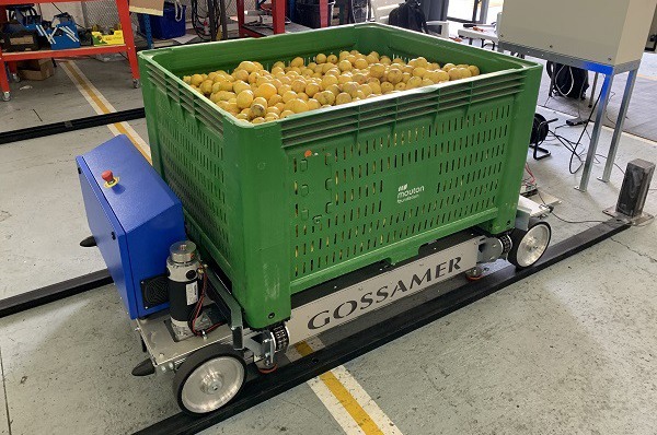 De shuttle kar van Gossamer met een bak citroenen (bron: Gossamer Packaging Machinery)