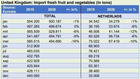 In januari en februari van dit jaar importeerde het Verenigd Koninkrijk nog vrijwel even veel verse groenten als in 2019 maar in maart was het dit jaar 6% minder dan in maart vorig jaar, in april 9% minder en in mei zelfs 16% minder.