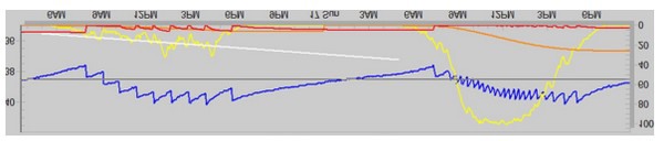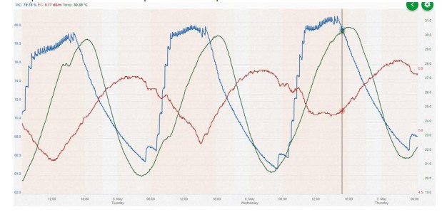 Dit is een goede manier om de irrigatie te beheren op een bewolkte dag. Merk ook op dat de EC (lichtblauwe lijn) omhoog gaat. Dat betekent dat tijdens de volgende zonnige dag de irrigatiefrequentie moet worden verhoogd midden op de dag om de EC weer te verlagen.