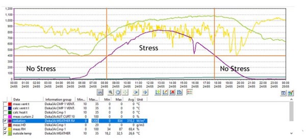 Figuur 4 toont aan wanneer er stress is bij de plant als het aankomt op zonlicht. Tijdens stressvolle periodes moeten telers het makkelijker maken voor de plant om water op te nemen. Tijdens minder stressvolle periodes moeten telers het juist moeilijker maken voor de plant om water op te nemen om wortelgroei te stimuleren.
