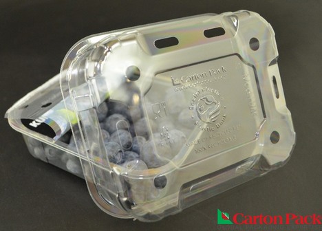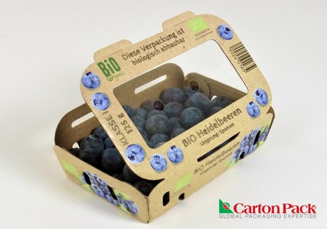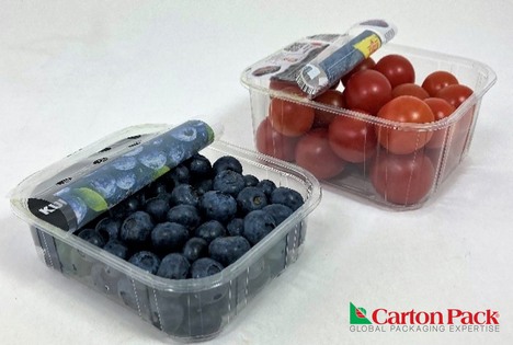 Het microgolfkartonnen alternatief van Carton Pack voor de bekende rPet clamshell heet CartonShell. "Dit gepatenteerde model is heel vochtbestendig, heeft een stevige structuur en is perfect geschikt voor afvullijnen en geautomatiseerde verpakkingsprocessen, ook met standaard sluitingen."