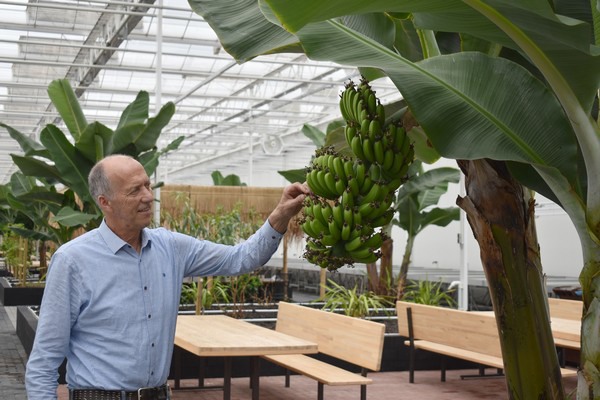 Naast de proefopstelling valt het oog op de bananenbomen die her en der in de demokas zijn neergezet. “Ik heb ooit eens een stekje meegenomen uit Ethiopië. De bananenbomen stonden ook al op onze oude locatie. Ze groeien hier hard want je ziet al her en der nieuwe boompjes boven de grond uitkomen. De bananen, die de bomen geven, verdelen we onder de werknemers.”