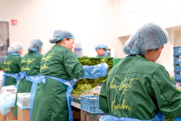 Waar het rustig is in de demokas is er volop bedrijvigheid in de naastgelegen ruimte waar men handmatig de kruiden sorteert en verpakt. Piet is streng als het gaat om de onderlinge afstand tussen de werknemers. “We letten goed op dat de regels van het RIVM in acht worden genomen. Hierop is continu toezicht. Alles is eenrichtingsverkeer binnen het bedrijf en de noodzakelijke maatregelen zijn genomen. Werknemers zijn belangrijk voor het sorteren en verpakken van de kruiden want we werken uitsluitend met klasse 1, want dat is de kwaliteit waar wij als teler om bekend staan.”