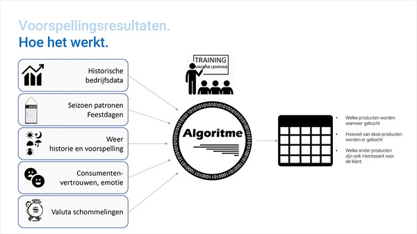 Voor het nauwkeurig voorspellen van de verwachte klantvraag (op volume en eindproduct niveau) worden algoritmes gebruikt. De algoritmes worden gevoed met historische bedrijfsdata en externe bronnen die invloed hebben op het koopgedrag: