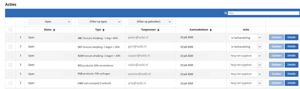 Nadat de algoritmes en bedrijfs specifieke richtlijnen zijn ingeregeld en getraind, wordt aan de demand planners alerts getoond met aanbevelingen om de productie aan te passen.