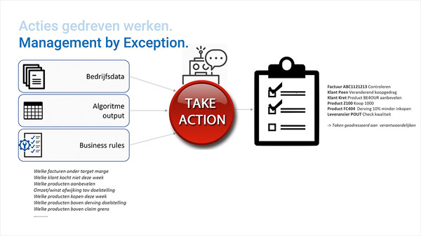 Hoe het werkt: Vanuit diverse bronnen worden de afwijkingen geanalyseerd. De business rules en taken algoritmes geven aanbevelingen voor het bijstellen van de productenplanning.