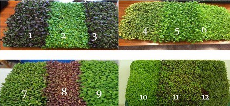 De onderzochte microgroenten: 1.mosterdspinazie; 2. tatsoi; 3. paksoi 4. tuinkers; 5. mibuna; 6. mizuna; 7. snijbiet; 8. amarant; 9. koriander; 10. groene basilicum; 11. paarse basilicum; 12. postelein.