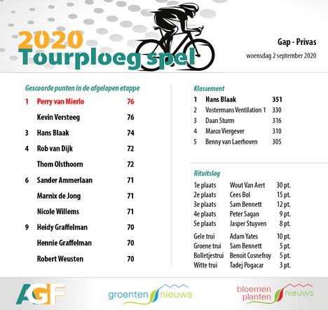 148 deelnemers aan het Tourploeg-spel scoorden, konden daarom 30 punten bijschrijven, waaronder Hans Blaak. Hij blijft fier aan kop staan. Dagwinst was er voor Perry van Mierlo en Kevin Versteeg.