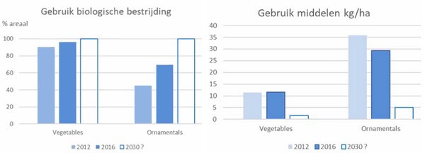 Om met dat laatste te beginnen: waar staan we überhaupt, hoeveel telers gebruiken biologie, in welke mate, en wat staat er nog te gebeuren? Qua strategie heeft de overheid mooie plannen: niet alleen is de wereld in 2030 weer een plastic- en fossielvrije Jurassic Park, ook is dan alle productie ‘duurzaam’ en het gebruik van gewasbeschermingsmiddelen tot een ‘minimum’ teruggebracht. As we speak gebruiken (in Nederland) zo’n 95% van de groentetelers biologische gewasbeschermingsmiddelen. In de sierteelt is dat zo’n 70%. Het gebruik van chemie (in kg/ha) is ondertussen over de laatste paar jaren niet per se afgenomen (maar in de groenten zelfs weer ietsjes toegenomen, zie grafiek hieronder). Daar zijn logische kanttekeningen bij te plaatsen - die middelen zijn van een orde als de chemische wapens van vroeger en ook mag er steeds minder – maar of “we” in een klein decennium de natuur volledig naar ons hand gezet hebben, is overal buiten de hogere echelons maar zeer de vraag.