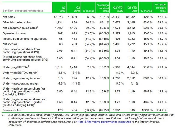 Toch heeft het concern de hogere omzet niet zien resulteren in meer winst. Dat kwam vooral door een hogere investering in het pensioenfonds (45 miljoen euro aan servicekosten, 11 miljoen meer dan normaal) en investeringen om de filialen coronaproof te maken wat in Q3 neerkwam op 140 miljoen euro. Hierdoor daalde de operationele kosten in Q3 2020 naar 207 miljoen (Q3 2019 = 472 miljoen).