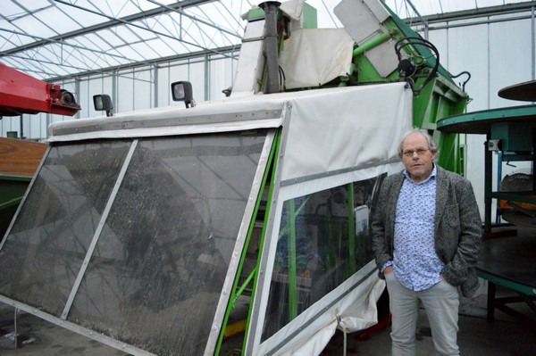Bert bij een spruitenplukker, ooit de eerste machine die hij verkocht