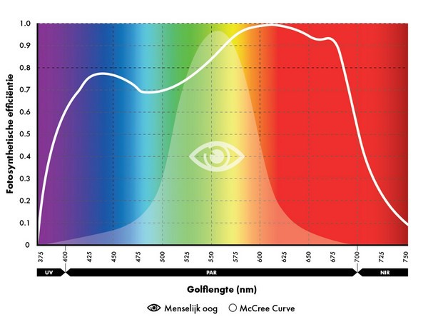 Niet alle licht binnen het PAR-traject leidt tot evenveel fotosynthese. Dat laat de McCree-curve zien. Er zijn duidelijke pieken te zien in het rood en het blauw; daartussen zit een dal. Die specifieke vorm van de curve heeft tot nogal wat misverstanden geleid. Het hardnekkigste daarvan is dat groen licht niet belangrijk zou zijn. Ten eerste is in de curve duidelijk te zien dat de fotosynthese in het groene deel weliswaar lager is, maar zeker niet nul. Ten tweede is de grafiek opgesteld op grond van metingen aan individuele bladeren. De respons van het hele gewas op lichtkleuren is net iets anders en het grootste verschil zit in het dal bij groen licht. Voor een heel gewas zie je bij groen namelijk nauwelijks een dal. De verklaring hiervoor is als volgt: Het groene aandeel van het licht dat op het eerste blad valt, wordt maar voor een deel benut. Het niet benutte deel valt door het blad heen op bladeren daaronder, waar steeds weer een deel benut wordt. De totale benutting is dan toch nog heel hoog.