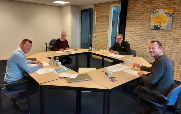 V.l.n.r. Gerard Drogt (adviseur vanuit Flynth adviseurs en accountants) en de bestuursleden Stefan van Adrichem, Jan van Ruyven en Maurice Weijs bij de ontbinding van Coöperatie Waterzuivering WEST10 U.A.