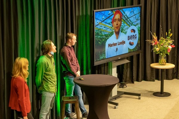 Pieter Ammerlaan (Havecon), Angela Barendregt (Hoogendoorn) en Thijs Res (VB Group) presenteerden een filmpje, waarin enkele leden uit de eerste lichting van deze tuinbouwtechniektalentenclub (die een vervolg krijgt met een tweede lichting zo vertelde AVAG-voorzitter Annie van de Riet trots) hun licht lieten schijnen over die kas in 2030.