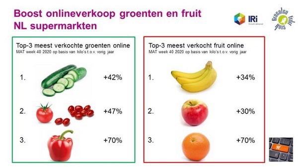De top-3 meest verkochte groenten online zijn komkommer, tomaat en paprika. Banaan is het meest verkocht fruit online, gevolgd door appel en sinaasappel.