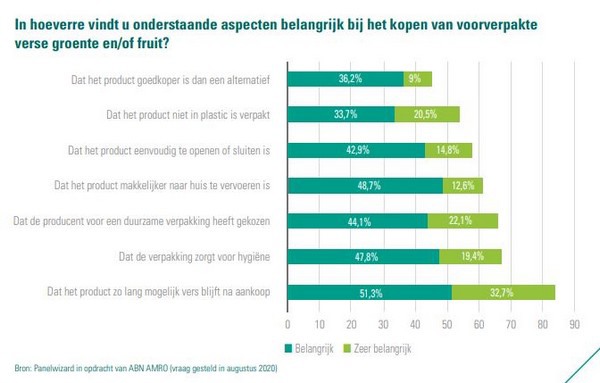 duurzamere verpakkingen, zoals blijkt uit onderzoek door Panel Wizard onder ruim 1000 Nederlanders in opdracht van ABN AMRO. Zo geeft 66 procent van de consumenten aan het belangrijk tot zeer