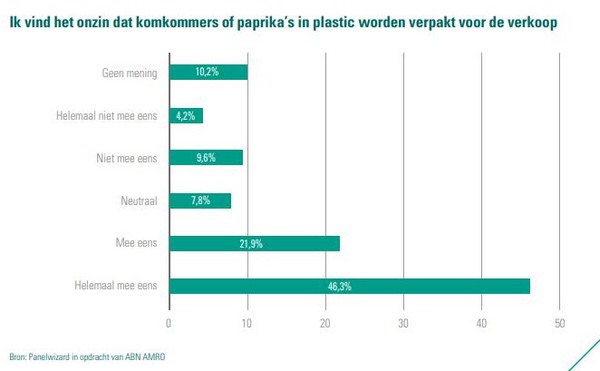 Ook kiezen consumenten in de supermarkt het liefst voor een voedingsmiddel zonder plastic verpakking. Een groot deel vindt het namelijk onzin dat komkommers of paprika’s in plastic worden verpakt voor de verkoop.