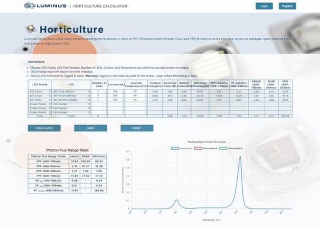De nieuwe tuinbouwcalculator van Luminus Devices biedt systeemengineers de mogelijkheid om uit 30 ledlampen te kiezen en hun eigen 'recept' voor specifieke belichting te creëren en dit op te slaan. Systeemengineers kunnen meerdere ledlampen selecteren en voorwaarden instellen voor de bedrijfsactiviteiten, inclusief de huidige en overgangstemperatuur en de fotosynthetische foton flux (PPF), optische kracht en elektrische kracht berekenen.