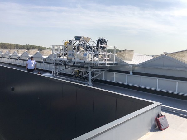 Ook voor het reinigen van de buitenkant hebben ze een Top Cleaner aangeschaft. Die is al in bedrijf is genomen. Deze Top Cleaner is ook niet standaard. "De dekwasser staat op een tailor made platform dat bovenop het dak van een corridor is gebouwd."