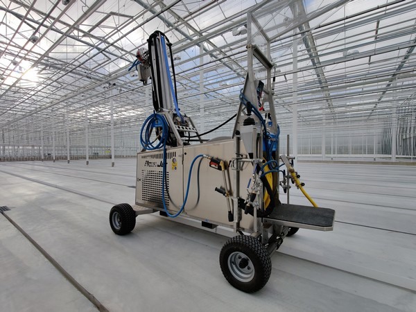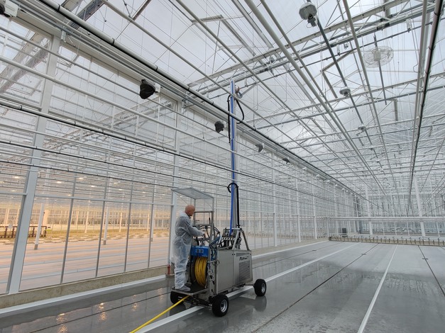 Tom Zwanenburg van Van der Waay, dat de machine bouwde en leverde, legt uit dat het een speciale AquaJet is. "Normaliter rijdt een AquaJet over de buisrail, maar deze heeft een onderstel op luchtbanden met een hydraulische stuurinrichting. Zo kunnen ze ermee over de betonnen vloeren rijden om het kasdek schoon te spuiten. Het kassencomplex bestaat uit allemaal kleine afdelingen, welke ze meerdere malen per jaar willen kunnen reinigen met deze machine."