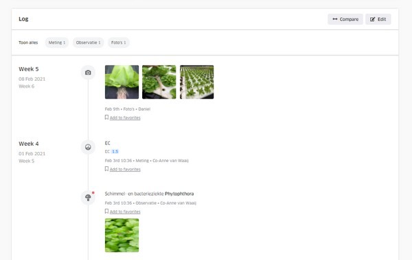 Log & Solve maakt het mogelijk voor telers om continue te blijven leren van voorgaande teeltcycli. “Door gegevens digitaal eenvoudig vast te leggen is het makkelijker over twee jaar nog eens te kijken hoe het toen ging. Dit kan eenvoudig in het ‘logboek’ wat automatisch gegenereerd wordt per teelt na het vastleggen van notities en foto’s en automatisch genereerde data zoals substraatanalyses en weerdata. Daarnaast is recent de vergelijkingstool gelanceerd, waarin eenvoudig verschillende teelten naast elkaar gezet kunnen worden. Door de logboeken te vergelijken, ontdek de teler verschillen en kunnen de lessen gebruikt worden in een nieuwe teeltcyclus.”