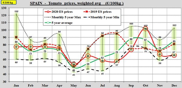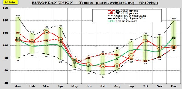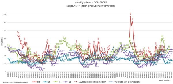 2020 werd ook een bijzonder jaar, met toen corona in Europa écht toesloeg in maart hamsterwoede en ook een vrije val van de Marokkaanse tomatenimport. De zomerperiode was vervolgens prijstechnisch niet om over naar huis te schrijven, waarna in oktober de al eerder genoemde prijspiek volgde, deels te verklaren door extreme hitte en lagere producties. Zowel die moeizame zomerperiode als de piek in oktober zijn in het Europees gemiddelde te zien.