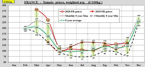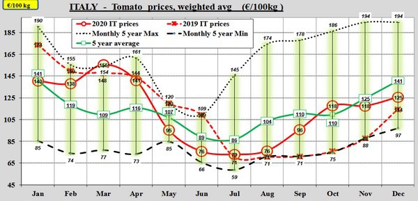 In Italië werd december afgesloten met een gemiddelde prijs die onder het vijfjarig gemiddelde uitkomt. Wel lag de prijs vanaf augustus continu aanzienlijk hoger dan in 2019.