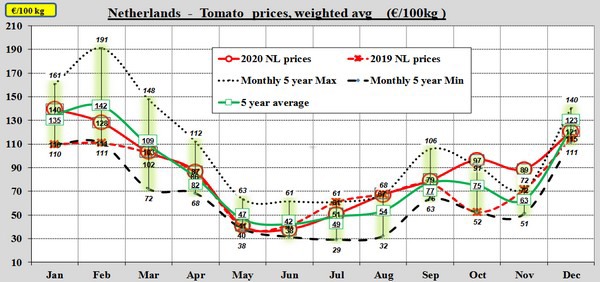 In Nederland, het land met de kleine marges, liggen de lijnen het hele jaar al dichter op elkaar. Hier waren traditioneel richting de feestdagen ook in het coronajaar 2020 stijgende prijzen te zien, met belichte telers in productie en onbelichte telers in de teeltwisseling.