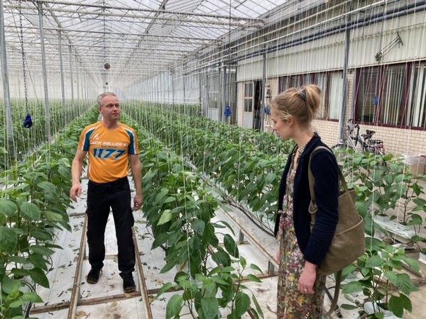 Vervolgens vertrokken de kleine delegatie naar paprikakwekerij Van der Spek in Bergschenhoek, een bedrijf dat de innovatieve oplossingen van Koppert Biological Systems daadwerkelijk toepast. Jantine werd er ontvangen door Danny van der Spek. Hij teelt daar samen met zijn vader, in een kas van 10 ha, oranje paprika's, zo biologisch mogelijk.