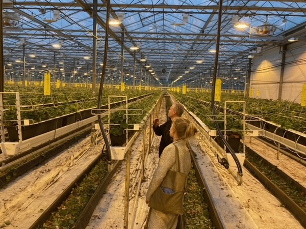 Het ging over paprika's, maar ook over aardbeien. De teler kocht in 2019 nog een kas aan, die nu vol staat met oogstbare aardbeien. Die worden bestuift door de bijen van Koppert Biological Systems.