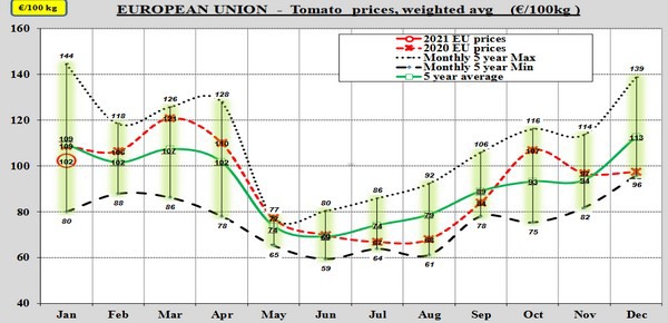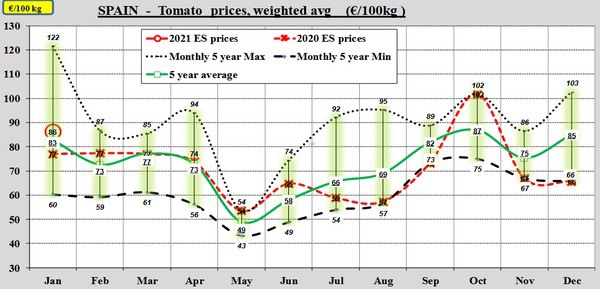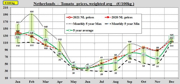 In Spanje en Nederland ging januari 2021 beter van start. De gemiddelde prijs in Spanje komt 3 eurocent boven de gemiddelde kiloprijs van het vijfjarig gemiddelde uit én 6 eurocent boven die van 2020. Daar zorgde vooral een grote kouprijspiek rond week 2 voor. Daarna is de prijs gaan dalen en als het vijfjarig gemiddelde wordt gevolgd, dan zet die daling richting februari ook door.
