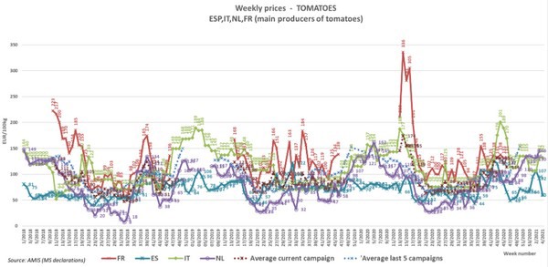 Tholen - Over de hele linie is tomatenjaar 2021 in de Europese Unie net iets onder gemiddeld gestart. Dit komt vooral door lagere prijzen in Italië in januari. Nederland en Spanje komen t/m week 4 iets bovengemiddeld uit, zo leren de cijfers.