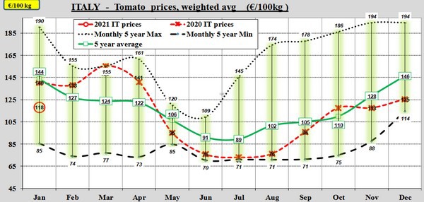 Die onder gemiddelde prijs is vooral te danken aan lagere prijzen in Italië. Daar zit voor januari tussen de prijs van 2021 en die van 2020 en het vijfjarig gemiddelde een gat van ruim 20 eurocent.