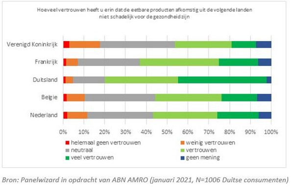 Meer dan de helft van de Duitse consumenten heeft (veel) vertrouwen in de voedselveiligheid van producten uit Nederland. Slechts een minderheid van 12 procent heeft geen of weinig vertrouwen en denkt dat producten uit ons land hun gezondheid schade kunnen berokkenen. De Duitse consumenten die geen of weinig vertrouwen hebben, noemen onder meer het gebruik van gewasbeschermingsmiddelen en het hoge cultiveringsgehalte als reden. De Duitse consumenten hebben meer vertrouwen in producten uit eigen land, op gepaste afstand gevolgd door producten uit Frankrijk.