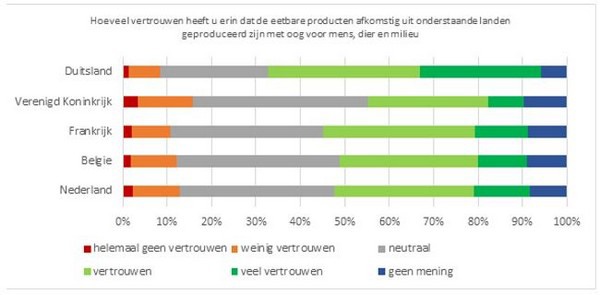 Minder dan de helft van de Duitse consumenten heeft er (veel) vertrouwen dat Nederlandse voedingsmiddelen duurzaam zijn geproduceerd. Nederland springt hier niet uitzonderlijk positief of negatief uit ten opzichte van België en Frankrijk, de twee andere in dit onderzoek meegenomen landen uit de Europese Unie (EU). Van de Duitse consumenten vindt 72 procent het enigszins tot zeer belangrijk dat het eten en drinken dat ze kopen duurzaam is.