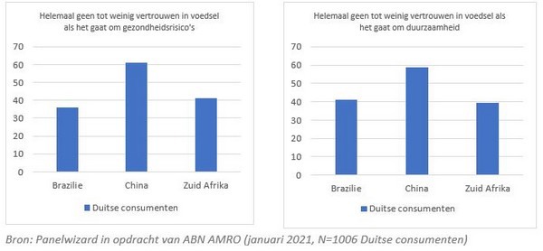 Maar zoveel vertrouwen als Duitse consumenten in producten uit eigen land hebben, zo laag is dat vertrouwen in producten uit een aantal landen buiten de EU. Duitse consumenten staan behoorlijk argwanend tegenover voedingsmiddelen uit China, Brazilië en Zuid Afrika.[1] Met name China wordt gewantrouwd. De consumenten uit het onderzoek hebben weinig fiducie in de Chinese standaarden en controlemechanismen op het gebied van voeding. Ook wordt naar de uitbraak van Covid-19 verwezen en naar de relatieve geslotenheid van het land als het gaat om de communicatie over gezondheid en duurzaamheid. Ook over de regelgeving en handhaving op het gebied van voedselveiligheid in Brazilië en Zuid-Afrika zijn Duitse consumenten kritisch.
