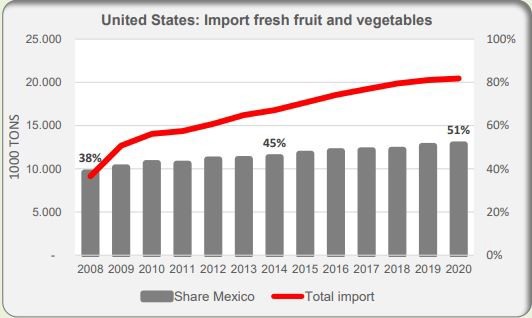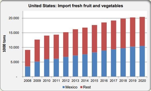 jaar ging dat om een hoeveelheid van bijna 1,7 miljoen ton. De import van paprika’s uit Mexico had in het afgelopen jaar een omvang van 1 miljoen ton. De import van Mexicaanse avocado’s is snel gestegen en in het afgelopen jaar was dat ook meer dan 1 miljoen ton. Van heel veel andere producten is het aandeel van Mexico in de totale Verenigde Staten-import ruim meer dan de helft. Van alle aardbeien die er in 2020 in de Verenigde Staten werden ingevoerd kwam