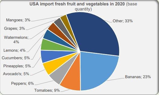 dan in 2019. In ongeveer tien jaar is de Amerikaanse import van verse groenten en fruit verdubbeld. De waarde van de Amerikaansen import bedroeg in het afgelopen jaar ruim 26 miljard dollar. De Verenigde Staten is wereldwijd veruit de belangrijkste importmarkt voor verse groenten en fruit. Duitsland, de nummer twee, importeert jaarlijks rond de 9 miljoen ton, Rusland is de volgende met 7 miljoen en China is de nummer vier met 6 miljoen ton.