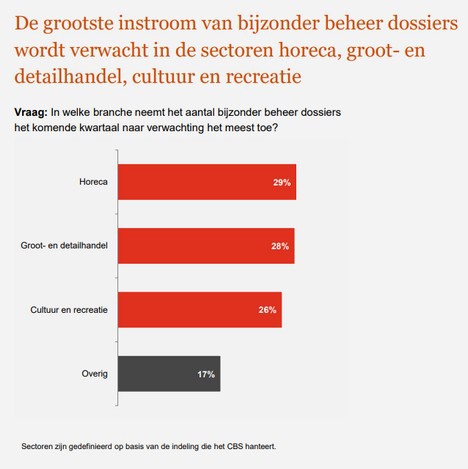 Het niet kunnen terugbetalen van al uitgestelde belasting zal in het aankomende kwartaal de belangrijkste reden zijn voor instroom bij bijzonder beheer. Vooral bedrijven uit de horeca, de groot- en detailhandel en de cultuur- en recreatiesector. De piek in de instroom bij bijzonder beheer wordt verwacht in het derde kwartaal van 2021.