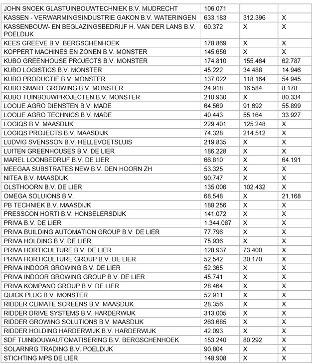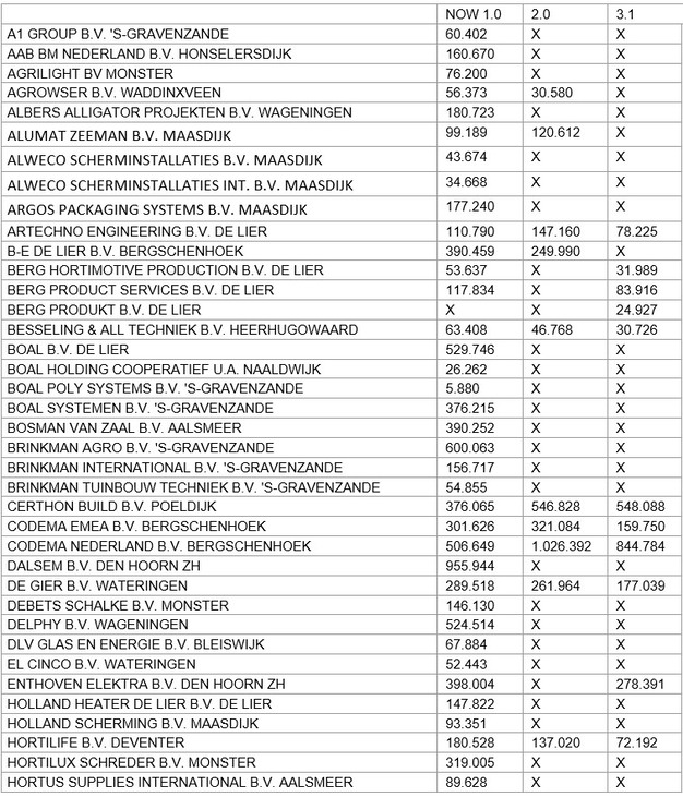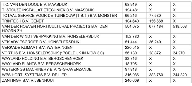 En hieronder de tuinbouwlijst van de redactie. Geprobeerd is een overzicht te geven van alle tuinbouwtoeleveranciers die in de NOW 3.1 een voorschot van meer dan 50.000 euro ontvingen (of in eerdere rondes). Zoals al gezegd: wij pretenderen niet volledig te zijn, maar geven met de lijst een inkijkje in de financiële situatie in de sector. Daarbij dient men te bedenken dat het uiteindelijk de telers zijn die producten van tuinbouwtoeleveranciers afnemen en dat als zij het zwaar hebben, toeleveranciers dat ook (gaan) merken. Verder is het belangrijk te bedenken dat de bedragen in onderstaande lijst soms ook alweer teruggestort zijn.