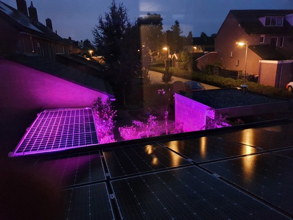 Er liggen zonnepanelen op de kas, die ook is uitgerust met rolgordijnen tegen de uitstraling (nog niet hier op de foto)