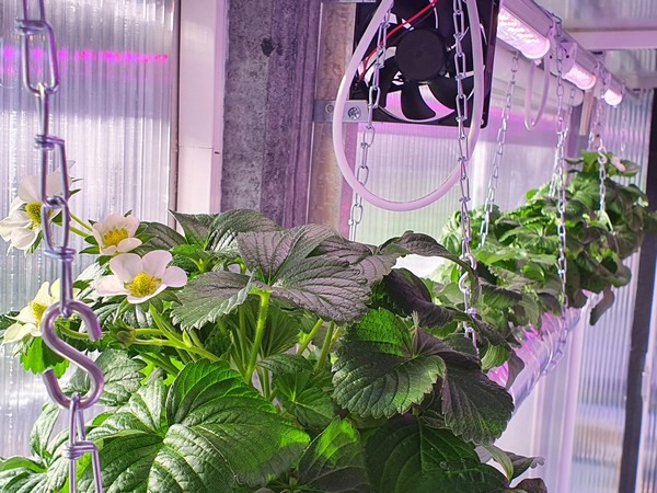 De nieuwe 'aardbeienbalk' waarop Theo teelt met bloei