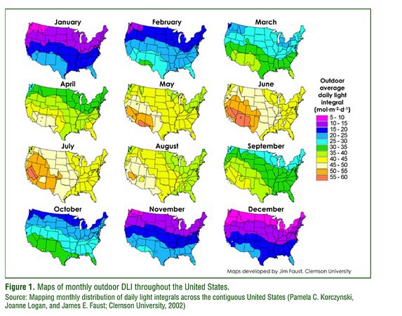DLI verandert van nature met de seizoenen, de tijd van het jaar, de lengte van de dag en de breedtegraad. Elk van deze factoren beïnvloedt de waarde van de DLI en wat een teler zou moeten doen om het te verbeteren.