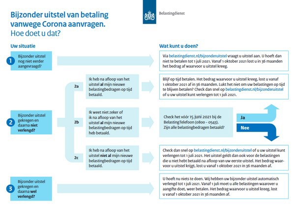 Alle ondernemers met bijzonder uitstel van betalen komen in aanmerking voor de betalingsregeling, mits zij na afloop van de uitstelperiode hun belastingen weer op tijd betalen. Lukt dat niet, dan kunnen zij hun betalingsuitstel verlengen tot 1 juli. Ook ondernemers die nog niet eerder uitstel aanvroegen, kunnen nog tot 1 juli bijzonder uitstel van betalen aanvragen. Aanvragen of verlengen kan op belastingdienst.nl/bijzonderuitstel.